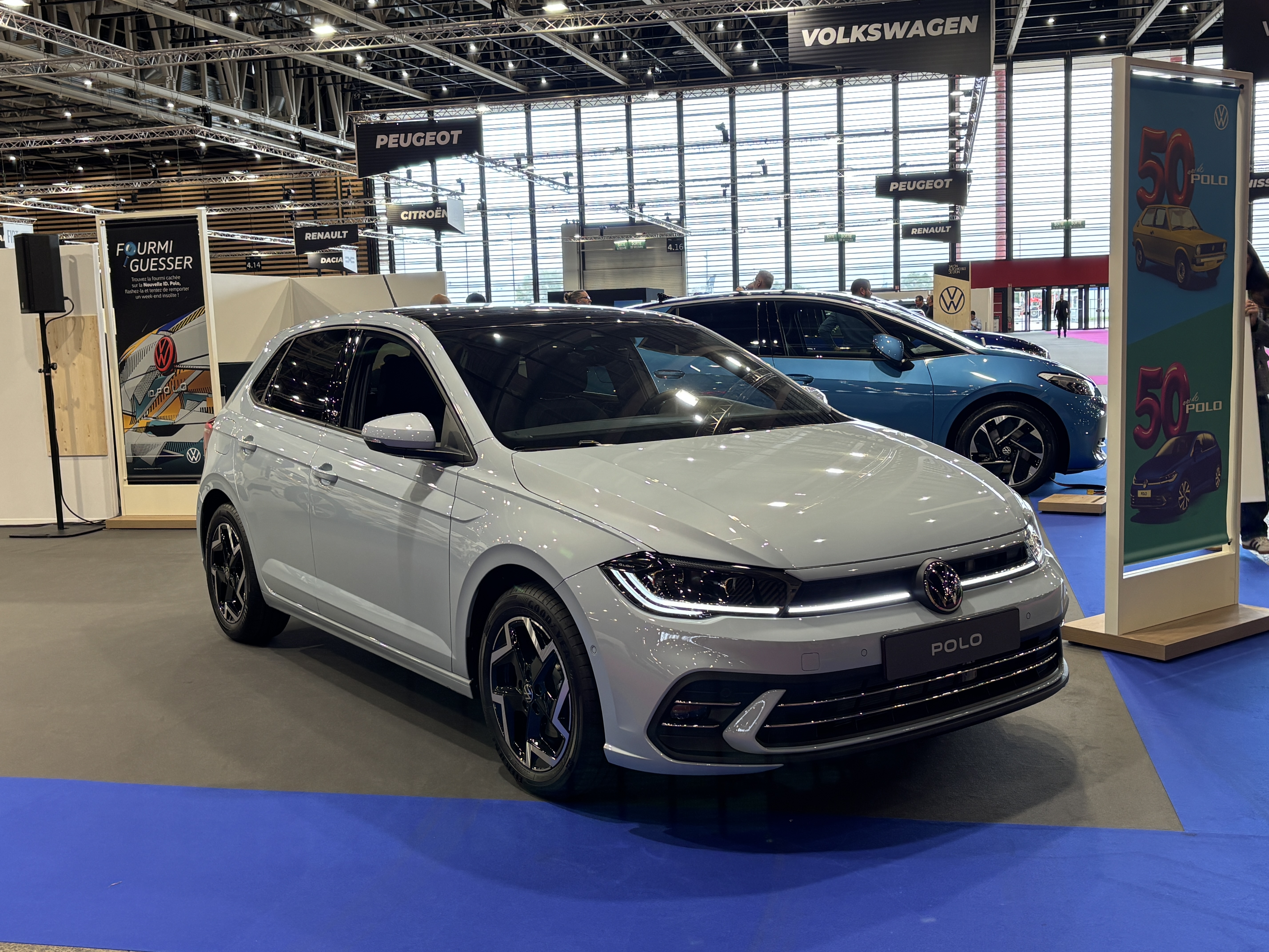 La citadine de Volkswagen célébre à Lyon son 50e anniversaire. Le constructeur expose la série spéciale Edition 50, à l’équipement riche et à la finition exclusive. Uniquement disponible en TSI 95 DSG7, elle est affichée à 28 240 €. Le « 50 » orne les montants centraux et la branche inférieure du volant. Les seuils de porte avant et la planche de bord portent l’inscription « Edition 50 ». Surtout, elle profite d’une dotation plutôt complète avec climatisation automatique bizone, tableau de bord numérique, écran tactile de 8”, navigation, etc. A ses côtés, la Polo GTi toujours équipée d’un 2.0 TSi de 207 chevaux (0 à 100 km/h en 6,5 secondes) mais de plus en plus pénalisé par le malus, ce dernier approchant des 3 000 €.