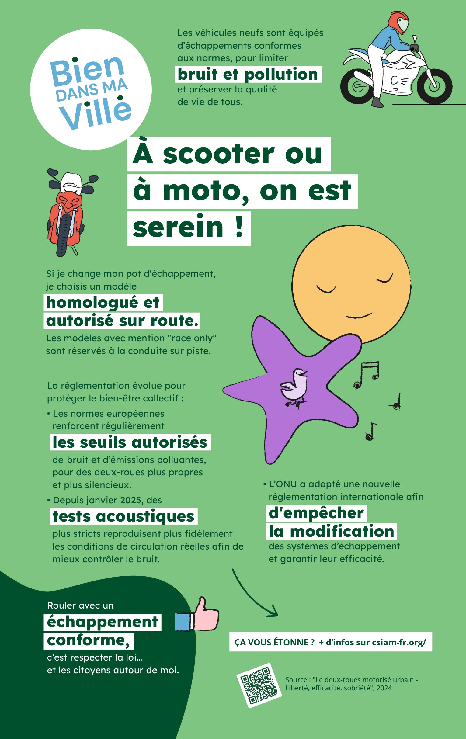 Praticité, sécurité, liberté, les arguments en faveur des deux-roues motorisés sont mis en avant par la CSIAM dans la campagne « Bien dans ma ville », sans oublier le volet écologie, qui souligne les faibles émissions polluantes des motos et scooters et la fluidification du trafic.